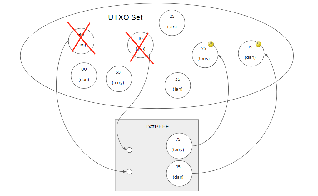 Bitcoin的历史由一连串的交易构成,交易内部的主要结构是输入和输出。交易更改状态的方法是,把当前状态中包含的一些UTXO(交易输入引用的那些)标记为已花费,从UTXO集合中移出,然后把一些新的UTXO(这个交易的输出)添加到UTXO集合里面去。